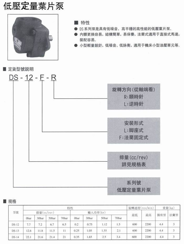 1、DS系列泵是具有低噪音、高平穩、高性能的低壓葉片泵