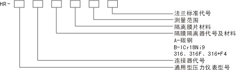 | 標記1:Y-100B/SR/MF(A)/316/4PMa/50- 4.0HGJ46 通用儀表為Y-100B不銹鋼壓力表,連接形式為SR散熱式,采用敞開式凸面法蘭MF,隔離器(法蘭)材料為碳鋼,膜片材料為316不銹鋼,測量范圍0~4.0MPa。法蘭標準50-4.0HGJ46。 標記2:YSG-2/Z/MG(B)/哈/1MPa/20-4.0HGJ47 通用儀表為HR-YSG-2電感壓力變送器,連接形式為直接,采用工字型法蘭MG,隔離器(法蘭)材料為1Cr18Ni9,膜片材料為哈氏全金,測量范圍0~1MPa,法蘭標準為20-4.0HGJ47。 |