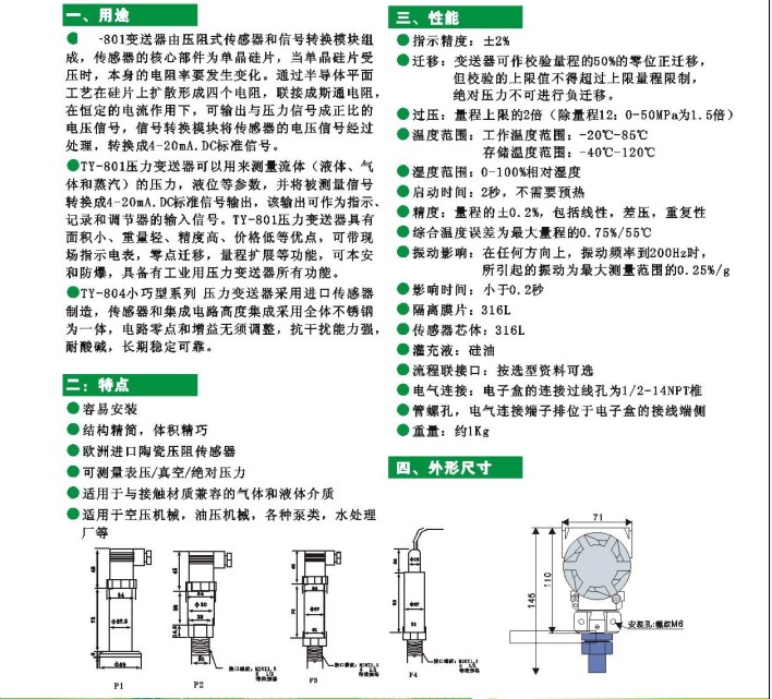BLH-801壓力變送器由壓阻式傳感器和信號轉換模塊組成,傳感器的核心部件為單晶硅片,當單晶硅片受壓時,本身的電阻率發生變化,通過半導體平面工藝在硅片上擴散形成四個電阻,連接成斯通電橋,在恒定的電流作用下,可輸出與壓力信號成正比的電壓信號,信號轉換模塊將傳感器的電壓信號進行處理,轉換成4-20mA標準信號。