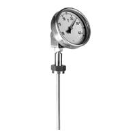 | 雙金屬溫度計是基于繞制成環性彎曲狀的雙金屬片組成。一端受熱膨脹時,帶動指針旋轉,工作儀表便顯示出所應的溫度值 |