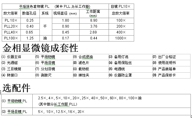 10X/0.25、20X/0.45、40X/0.65(彈簧)、100X/1.25(油、彈簧)