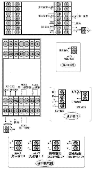LCD系列,帶控制(或報警)輸出液位<=>容積控制儀,輸入類型為4~20mA,繼電器控制輸出,帶RS-485通訊,帶上下限繼電器報警輸出,帶DC24V饋電輸出,橫表。