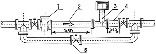 流量計可以垂直安裝,或任意角度傾斜安裝。 1、過濾器 2、前直管段 3、流量計 4、后直管段 5、旁通閥 ![]() ■選型