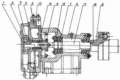 | 1.泵蓋 2. 泵體 3. 葉輪 4. 填料 5. 填料壓蓋 6.托架 7.滾珠軸承 8. 聯軸器 9.葉輪平健 10.泵軸 11.填料環 12.軸承壓蓋 13.法蘭盤 14.聯軸器平健 |