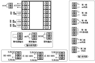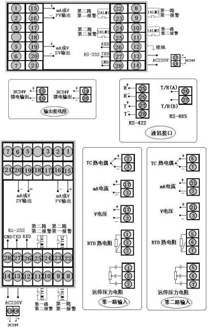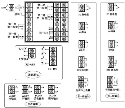 測量顯示,通訊方式為RS232,一路輸出方式為繼電器輸出,第二路輸出方式為4~20mA,一路輸入類型為CU50,第二路輸入類型為Pt100.1,一路一報警為上限報警,一路第二報警為下限報警,第二路一報警為上限報警,第二路第二報警為下限報警,DC24饋電輸出,供電方式DC24V。