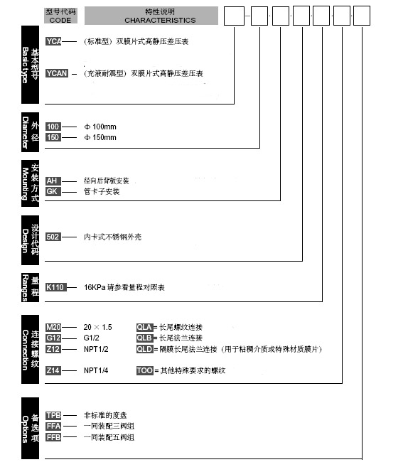 表殼充油: YCAN 充填硅油;YCA 為干式