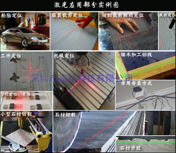 激光標線器的安裝機使用簡單方便,可安裝在使用機械的垂直或水平面上, 提供一條可見的激光標線,使得在整個生產過程中有一條可見的、非接觸的 定位線指導操作過程。具有方便生產操作和提高生產效率的優點。激光線 可在三維空間任意微調,已達到使用效果。 |