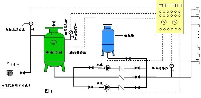 該設(shè)備采用微機控制變頻調(diào)速實現(xiàn)恒壓供水,其中的負壓補償系統(tǒng)克服了對管網(wǎng)的不良影響。流程圖如下: