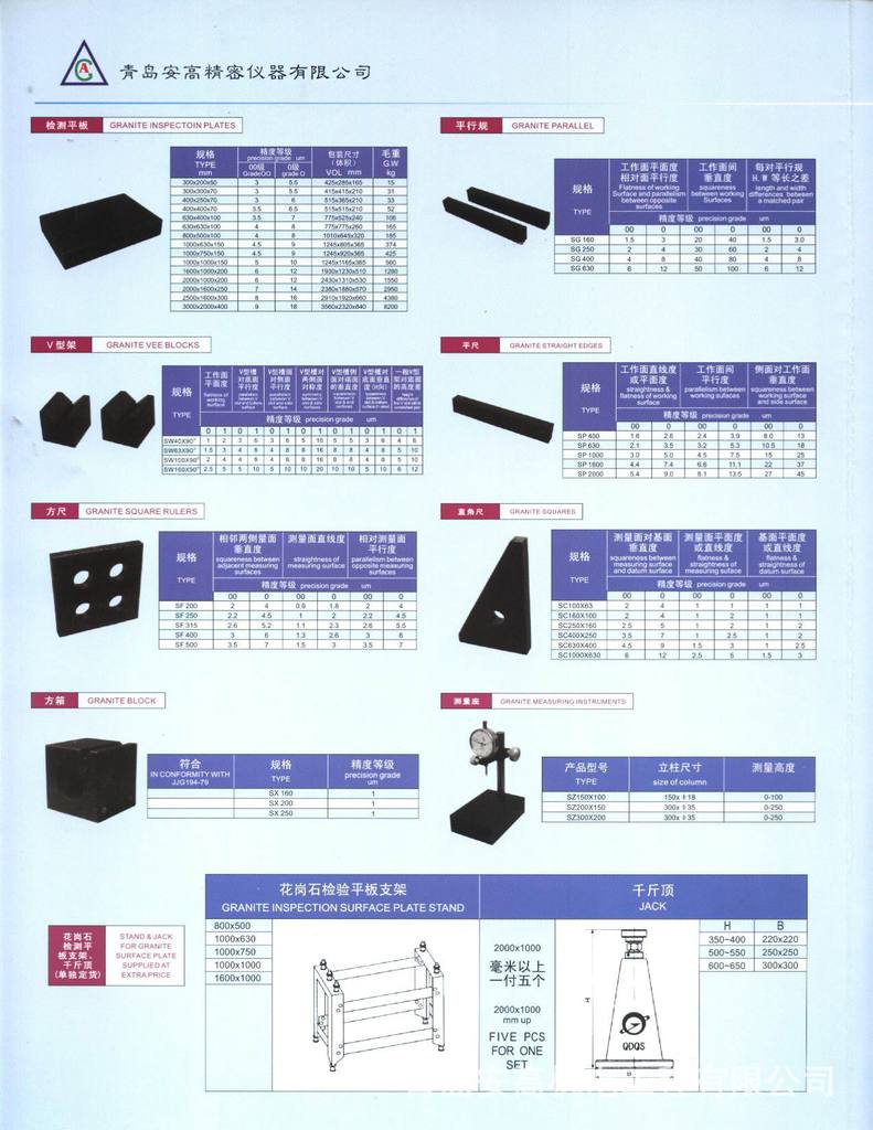 青島安高機(jī)電工程有限公司,是一家集設(shè)計(jì)、鑄造、加工為一體的專業(yè)性現(xiàn)代化公司。鑄鐵量具生產(chǎn)部:年生產(chǎn)各類鑄件4000余噸,可生產(chǎn)HT200、250、300等各牌號(hào)大、中、小型鑄件及各種工量具。按國(guó)標(biāo)生產(chǎn)各種規(guī)格鑄鐵檢驗(yàn)平板、劃線平板、焊接平臺(tái)、T型槽平臺(tái)、組合平臺(tái)、模具墊板、各類發(fā)動(dòng)機(jī)實(shí)驗(yàn)臺(tái)、落地鏜銑床輔助平臺(tái)、平行平尺、橋型平尺、方箱、直角尺、V型鐵、偏擺檢查儀、特殊規(guī)格帶表內(nèi)外卡規(guī)、數(shù)顯百千分表、磁力表座、機(jī)床檢驗(yàn)棒、機(jī)床調(diào)整墊鐵、機(jī)床防震墊鐵等工量具。鉗工維修工具產(chǎn)品有:平面刮刀、三角刮刀、半圓刮刀、蛇頭刮刀、柳葉刮刀;設(shè)有機(jī)械加工,精密恒溫加工、維修、計(jì)量檢測(cè)等車間,擁有大型精密石材加工和先進(jìn)的電子檢測(cè)設(shè)備,產(chǎn)品全部采用計(jì)算機(jī)數(shù)據(jù)處理,主要產(chǎn)品有花崗石精密測(cè)量平板、平尺、方尺、直角尺、方箱、彎板、V型塊、平行規(guī)、各類表座,公司是集精密加工異型加工于一體的大型花崗石精密產(chǎn)品的生產(chǎn)企業(yè)。是鑄鐵檢測(cè)產(chǎn)品和花崗石計(jì)量檢測(cè)產(chǎn)品的專業(yè)化制造商。工廠也接受非標(biāo)準(zhǔn)產(chǎn)品的定單,在青島發(fā)展二十余年,具有可靠的計(jì)量測(cè)試技術(shù)咨詢和維修服務(wù)能力,是各種工業(yè)在線檢測(cè)設(shè)備的綜合供應(yīng)服務(wù)商。
