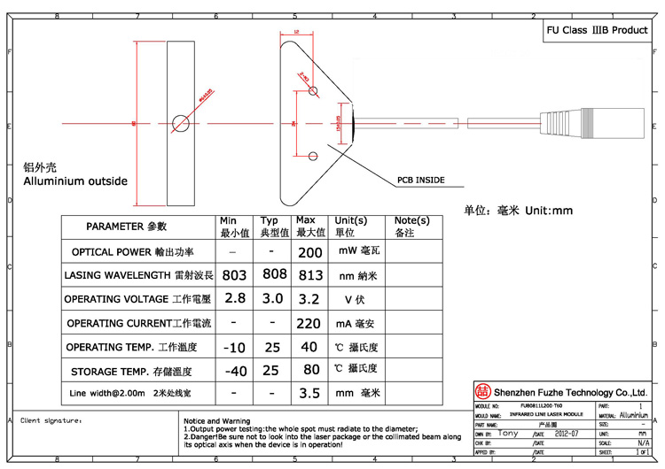 808nm激光燈打出一個扇形面,在目標上形成一條肉眼看不到的直線,需要用專門的設備觀察(如CCD攝像機),主要應用于觸摸桌面類、互動投影類產品中!