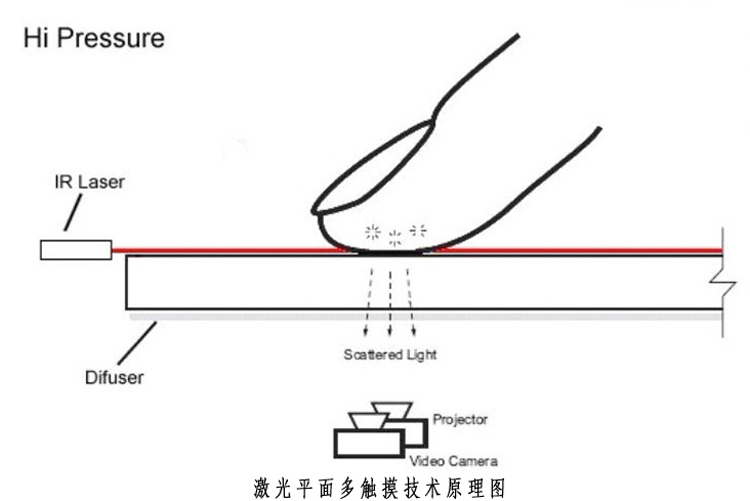 利用激光平面多點觸摸技術來實現多點觸摸裝置是種簡易以及價格的方法,多數的裝置需要四到六個激光頭(甚至八個),從屏幕的四個角落照射在平面上。激光光線的亮度取決于激光的功率(mw),功率越大亮度就越高,感應效果越好!
