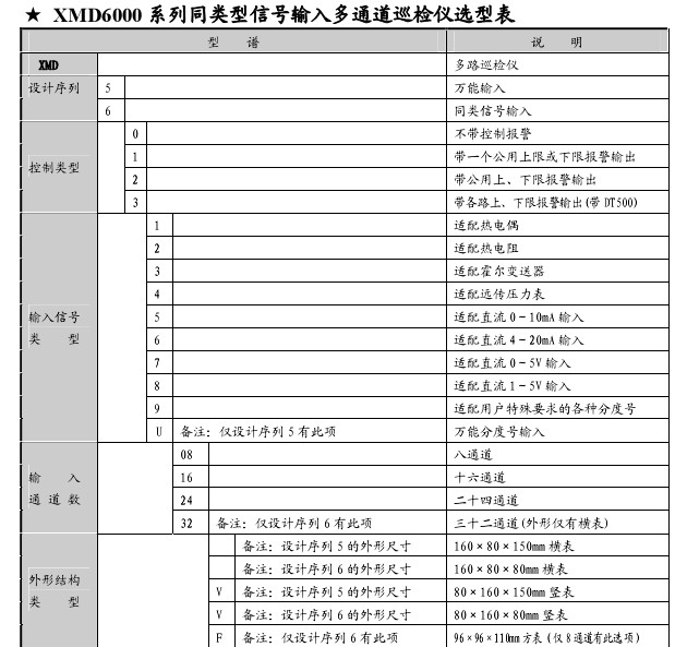 ※ XMD5000系列信號輸入多通道巡檢儀(8通道橫豎表/16通道橫豎表/24通道橫豎表)與XMD6000系列同類型信號輸入多通道巡檢儀(8通道方表/24通道橫豎表/32通道橫表)面板上還具有各路分別指示上、下限報警狀態指示燈(雙色發光二指示)。XMD6000多通道巡檢儀(8通道橫豎表/16通道橫豎表)面板上還具有各路上、下限報警公用指示燈。