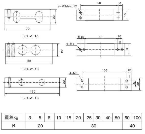 傳感器用途與特點 可按用戶要求訂制生產。 拉壓兩用、抗偏載性能好。 適用于電子臺秤、電子計價秤、配料秤、營養秤及小力值工業秤的測量與控制。 量程、規格、外形及安裝尺寸 量程Rang:3,5,6,10,15,20,25,30,5,60,100kg 安徽TJH-W鋁合金稱重傳感器廠家供應商 技術參數