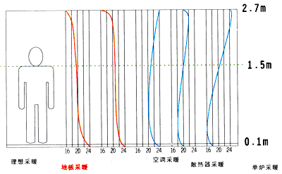 不同采暖方式的溫度分布 二、 室內(nèi)空氣更加潔凈 采用散熱片取暖,散熱片的溫度較好,一般出水溫度在70℃以上,當(dāng)溫度達(dá)到80℃時(shí),就會產(chǎn)生灰塵圍(碳化塵),使散熱片上方的墻上常常布滿灰塵的斑跡,同時(shí)加大了室內(nèi)空氣的流動(dòng),使空氣變得污濁。相比之下,地板低溫輻射采暖可以完全消除灰塵圍和污濁空氣的對流,給人一個(gè)清新、溫暖、健康的環(huán)境。 三、率節(jié)省能源 由于地暖的輻射面大,相對要求供水溫度低,只需40-50℃,如果選用16℃參數(shù)設(shè)計(jì),可達(dá)到20℃的采暖效果,是一種節(jié)能的采暖系統(tǒng)。此外,地板加熱系統(tǒng)可以改善一般安放在窗戶下的傳統(tǒng)采暖片,因窗戶密封不良,散失部分熱量所影響之采暖效果。相對于使用電采暖,使用水暖更加經(jīng)濟(jì)節(jié)能。 四、減少噪音 地暖系統(tǒng)使用過程寂靜無聲,相對與使用空調(diào)和暖氣片采暖能為您的居室提供更加安靜舒適的居住環(huán)境。 五、充分增加室內(nèi)空間利用率 相對與暖氣片采暖,采用地暖取消了暖氣片及其支管,增加了使用面積,便于裝修和家具布置。 六、使用壽命長 低溫地板采暖,塑料管埋入地板以下的模塊或混凝土層中,如無人為破壞,使用壽命在50年以上,不腐蝕、不結(jié)垢,大大減少了暖氣片跑、冒、滴、漏水和維修給住戶帶來的煩惱,可節(jié)約維修費(fèi)用。 |
