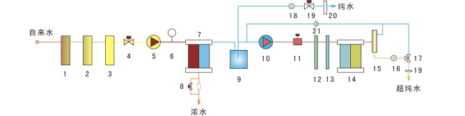 1.PP濾芯 2.碳濾芯 3.抗結(jié)垢化合物處理管柱 4.電磁閥 5.高壓泵 6.壓力表 7.RO膜 8.電磁閥 9.純水貯存系統(tǒng) 10.循環(huán)泵 11.壓力開關(guān) 12.紫外殺菌燈 13.紫外消解器 14.核級樹脂純化柱 15.超濾器 16.電阻儀 17.電磁閥 18.電導(dǎo)儀 19.電磁閥 20.終端過濾器 21.單向閥