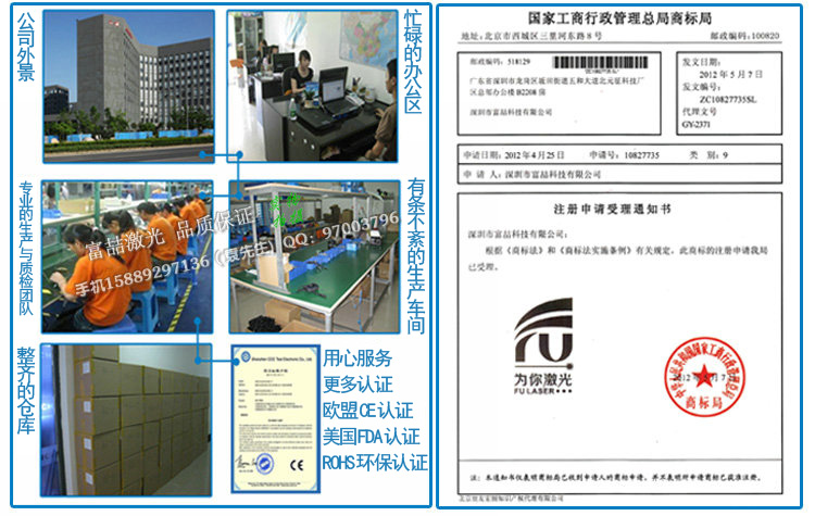1,本店鋪銷售的所有商品均為我工廠研發、生產,擁有的品質及價格,批零兼營,量大從優;詳情請咨詢客服 2,本公司一系列產品已通過(獲得)ROHS、CE、FDA等安全、環保證書!更多激光鐳射產品與激光鐳射解決方案請聯系客服,您所想要的,即是我們所追求的…… |
