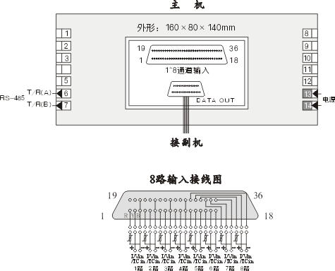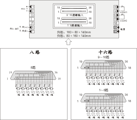 | ★注:1、8路分別輸出和16路巡檢儀有航空插頭和接線柱式接線,出廠默認接線柱式,如需航空插頭請訂貨時注明。32路巡檢儀接線方式只有航空插頭。 2、分別輸出為8路上限+8路下限控制報警輸出或8路分別變送輸出,輸出繼電器與變送二者選一。 選型舉例:WP-D806-02-23-N-T; WP-MD832-81-23-HL-T |