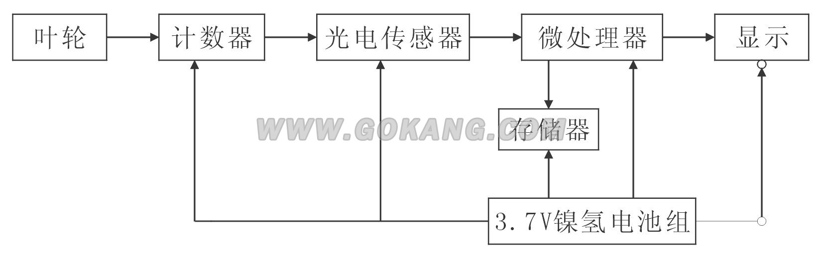 測量時,因為葉輪旋轉對光電傳感器形成遮擋,每遮擋一次就產生一個光脈沖信號,脈沖信號經計數器傳送到微處理器進行運算處理后,經顯示器顯示或存入存儲器保存。主要技術指標: