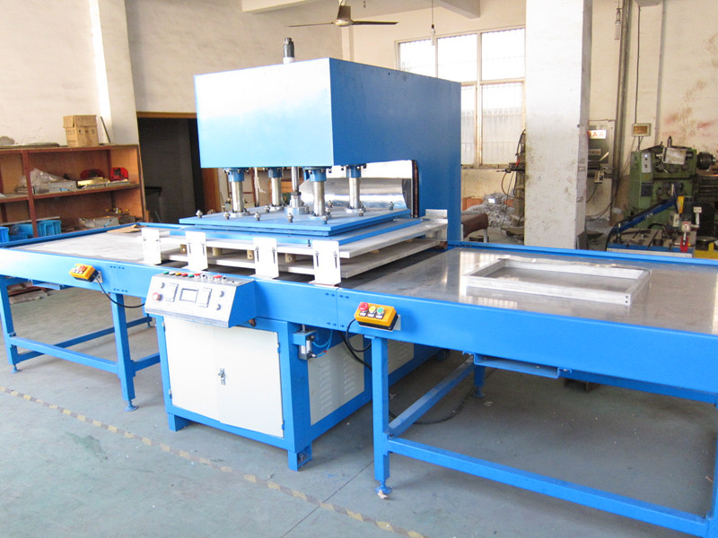 摩托車坐墊壓花機⑷單頭滑臺龍門式:工作臺面板設計成標準900*1700的工作臺面滑臺,分在機頭左右兩邊,操作方式是由操作人員手動推動工作滑臺板推到位,點動下降開關,機臺工作面板會自動下降熱合焊接過程全部由時間控制,兩邊工作臺面板滑臺交替使用
