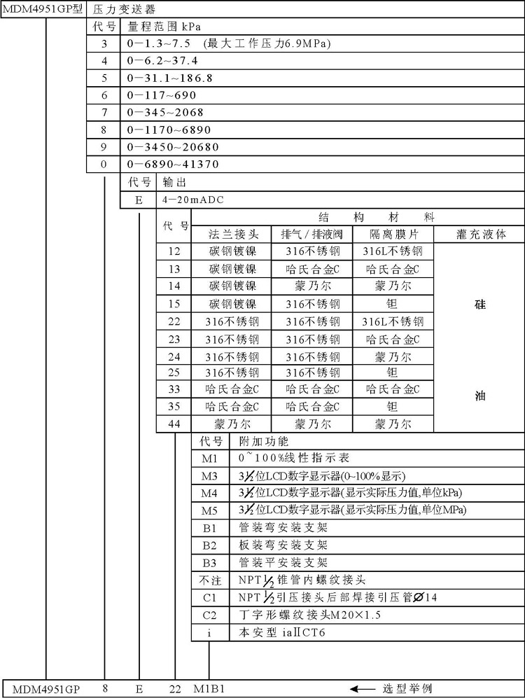 本公司生產的MDM4951系列電容式壓力、差壓變送器品種齊全,自微差壓至大差壓,從低壓力至高壓力、壓力、高靜壓差壓,用戶可按不同需要任意選用。接液材料除316L不銹鋼外,還有哈氏C合金、蒙耐爾合金、鉭、涂膜,可使用于各種腐蝕介質場合。