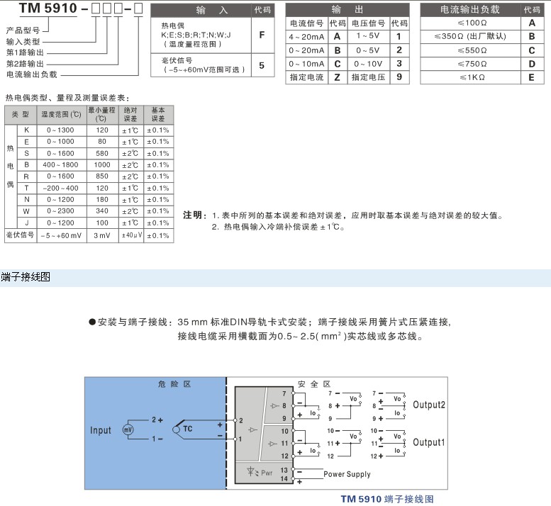TM5910熱電偶輸入, 溫度變送隔離安全柵 一入二出特性 接收現場危險區域的熱電偶信號或其它毫伏信號,經過隔離和線性化處理,