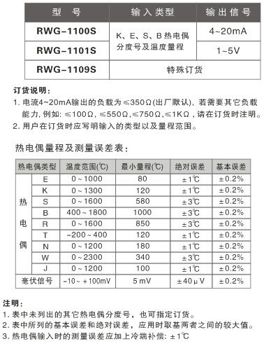 RWG-1100S模擬熱電偶輸入溫度變送器 一入一出特性 熱電偶溫度隔離變送。 輸出直流電流或電壓信號。 單通道,一入一出。