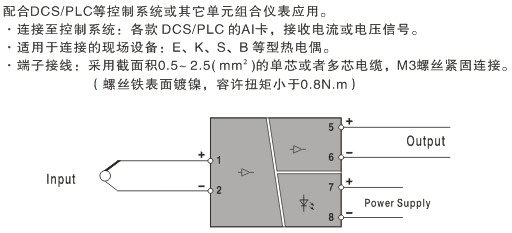 - 接收來自于現場的熱電偶信號或其它毫伏信號,經過隔離, 轉換為固定量程的標準直流信號輸出。