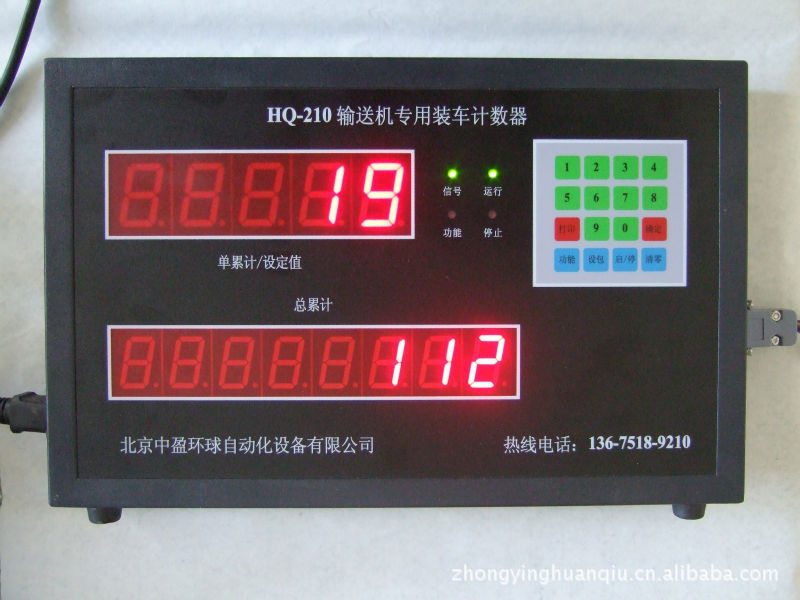 HQ-210計數控制器內置2個繼電器。當計數值達到預定數值時,機內執行繼電器A動作,用來開關電器設備(控制皮帶機或包裝機),達到自動控制的目的。當計數值達到預設數值的提前量時,計數器內置的繼電器B動作,可以觸發聲光報警設備(比如電鈴),提前報警以提示操作人員。