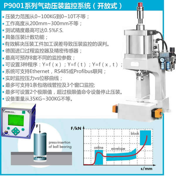 P9001系列氣動壓裝監控系統是以壓縮空氣為動源力,操作簡單。沒有油壓系統待機所產生的噪音,可節省電力消耗,降低生產成本。1T以上壓裝系統采用氣液增壓缸以達到較大壓裝力。機臺采用全鑄鐵結構,堅固耐用。P9001系列氣動壓裝監控系統壓裝力從100KG~10T不等,廣泛適用于各類零部件壓裝、鉚接、刻印、切斷、折彎、沖孔和成形等工藝過程控制中的【力vs位移】的曲線測試,可測量待測物壓力及位移的相對應的變化曲線,并通過預先對系統控制器設置好的曲線監控窗口實時監控產品是否合格,并做OK/NOK判斷報警,直觀明了,操作方便簡單。同時,P9001系列氣動壓裝監控系統若搭配上位機軟件,還能將測試曲線數據存檔,方便后續工藝分析及產品品質管控檔案的備份。