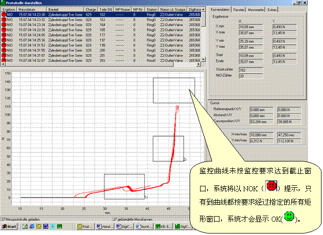 Y軸縱坐標代表壓裝力,X橫軸坐標代表壓裝行程。這個圖表示當壓裝時產生的力變化與壓裝行程相對應的關系曲線圖,一個可選的X采樣率,決定了X-Y數據的讀取。