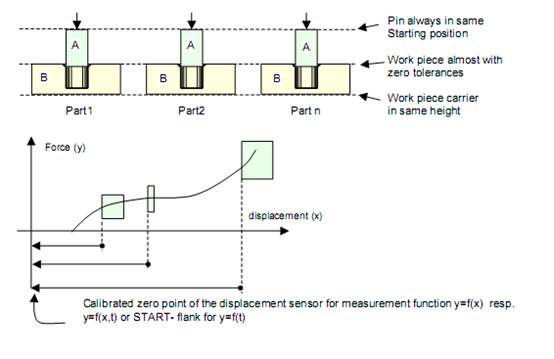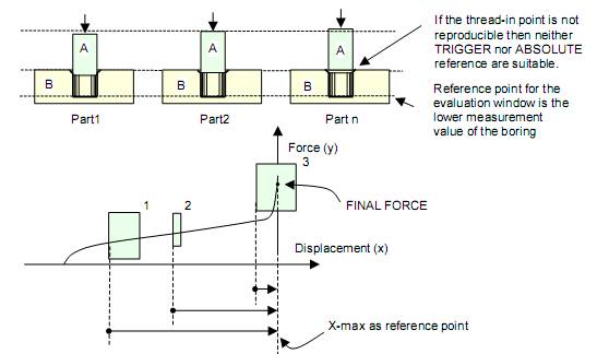 如果壓入部件工件位置的重復精度無法得到保障,如:由于壓入部件B的位移偏差。此時您需要選擇觸發參考。測試將在壓入基準與壓入部件A接觸時才開始。與此同時,位移X將被置零。此時,分析窗的位置以此為零點。如果不是這么做,壓入曲線會沿著X方向位移,這將會導致一個OK的部件得到錯誤的NOK信號。