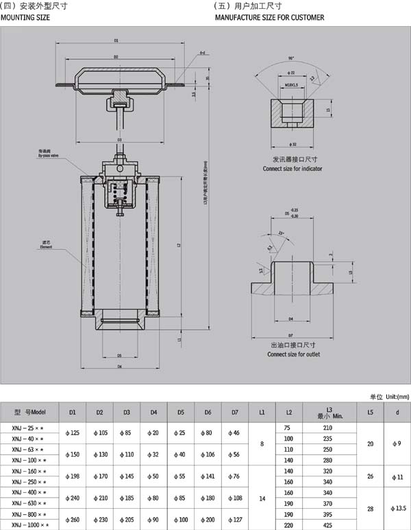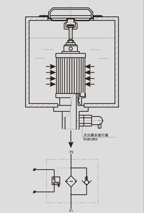 XNJ系列箱內吸油過濾器具有以下特點:9.安裝連接方便:本系列吸 油過濾器通過安裝法蘭固定在油箱的蓋板上,濾芯直接插入油箱,從而簡化了系統的管路,節省空間,使系統布置更為緊湊。b.清洗或更換濾芯時,要擰開安裝法蘭上的螺釘、拉起安裝法蘭,即可清洗或更換。c.帶有濾芯堵塞發訊裝置:當濾芯被污染物堵塞到真空壓力為—0.018 MPa時,發訊器發出開關信號(用戶外接電信號),這時應及時更換或清洗濾芯,以免油泵出現吸空等故障。d,帶有旁通閥:當濾芯被污染物堵塞到真空壓力為—0.18MPa時,此時如不能馬上停機清洗或更換濾芯,裝在濾芯上端的旁通閥會自動開啟(開啟壓力為—0.02MPa),以保護油泵正常工作。 用戶選用XNJ系列過濾器時,務必要安裝真空壓力發訊器。當濾芯被污染物堵塞到真空壓力為—0.018MPa時,應及時清洗或更換濾芯。
