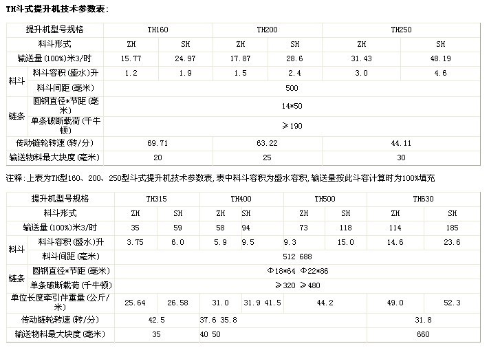 TH系列斗式提升機是我廠研制的新產品,具有輸送量大,提升高度高,運行平穩可靠,壽命長等顯著優點。TH系列斗式提升機適用于輸送粉狀、粒狀及小塊狀的無磨琢及磨琢性小的物料。TH型 斗式提升機是一種圓環鏈斗式提升機采用混合式或重力卸料,挖取式裝料。適用于輸送堆積密度小于1.5t/m3易于掏取的粉狀、粒狀、小塊狀的底磨琢性物料。如煤、水泥、碎石、砂子、化肥、糧食等。TH型斗式提升機用于各種散狀物料的垂直輸送。適用于輸送粉狀、粒狀、小塊狀物料,物料溫度在250℃以下。