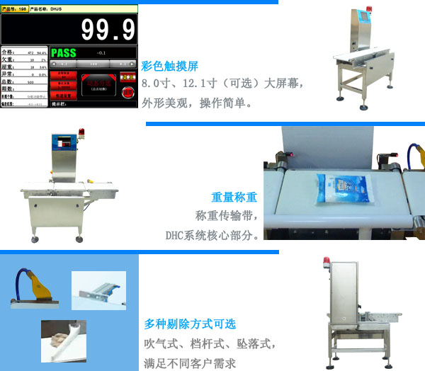 在線重量分選機技術參數:型號: DHC-S600zui高檢重精度: 1.0gzui大分選速度:120件/分鐘稱重范圍:50g ~ 10kgzui小分度值:0.1g稱重皮帶尺