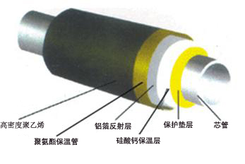 本公司生產的直埋預制蒸汽保溫管適用于輸送壓力2.5Mpa,溫度350℃以下的蒸汽管道。針對輸送介質的高壓、高溫特點,一般采用復合保溫結構(無機保溫層和有機保溫層)進行保溫;產品外護管以高密度聚乙烯(PE)外護管為主(也可按照要求采用鋼管外護管)。