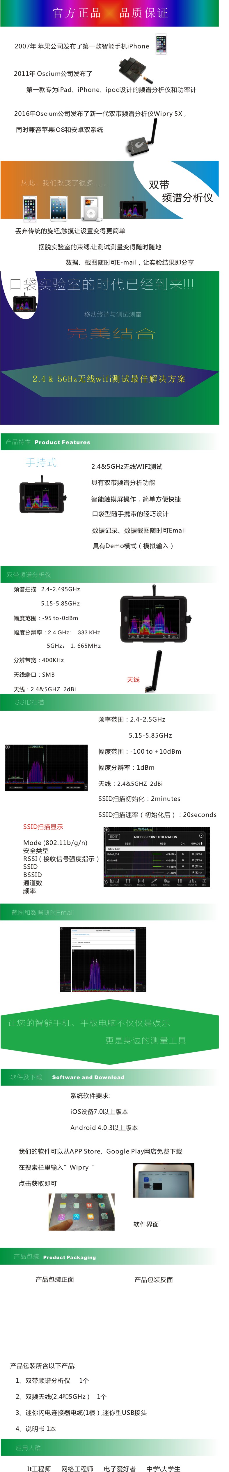 新一代Wipry 5X為頻譜分析儀Wipry Combo的升級版本,主要針對2.4 & 5GHz兩個頻段的wifi信號進行測試,同時兼容蘋果iOS和Android雙系統;具有雙帶頻譜分析功能,智能的觸摸屏操作,簡便快捷,口袋型輕巧的設計,對數