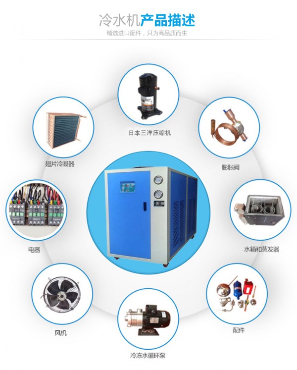 1冷水機,通過自身吸入冷空氣,排出熱空氣,散熱無需外接散熱塔,安裝、移動方便。主機采用歐美日進口壓縮機,內置安全保護,運行可靠,效率高,噪音低,省電耐用,使用壽命長。