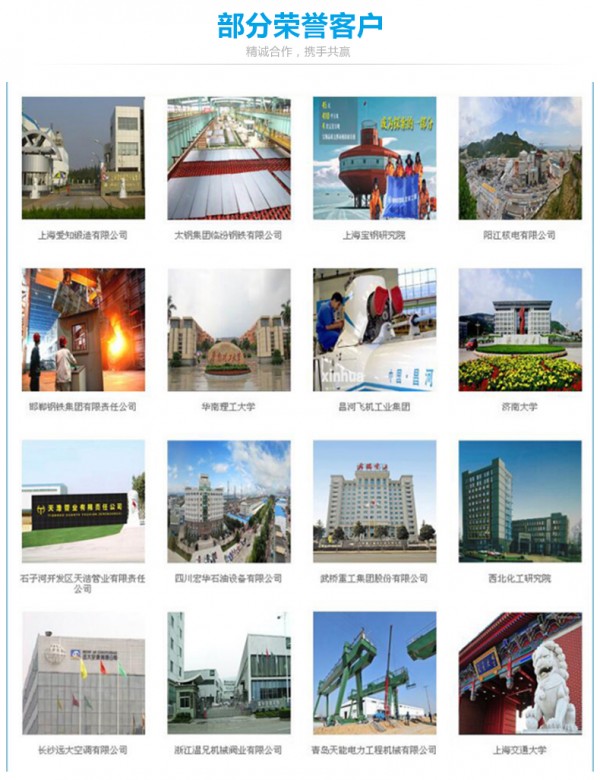 多年來與企事業單位及科學研究所長期合作如:邯鄲鋼鐵集團、昌河飛機工業集團、臨汾鋼鐵集團、秦南重工、廣州鍛造、青島天能電力、上海寶鋼研究院、長沙遠大空調、武橋重工集團、齊齊哈爾軌道交通裝備、上海交通大學、山東理工大學、西北化工研究院、東北化工研究院、河北鋼鐵集團、機械部哈爾濱焊接、渤海造船、佳力風能、福建永寶特鋼閥門等……