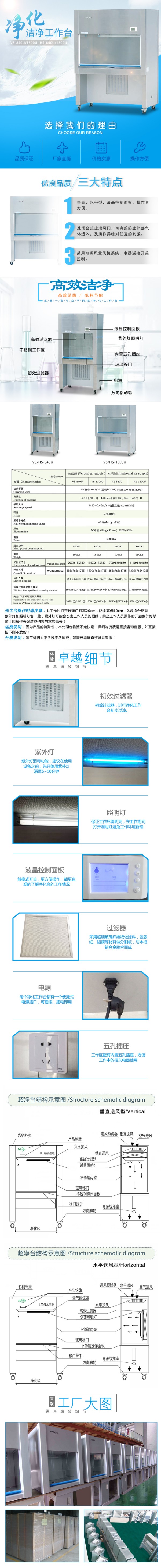 1、采用超薄型無隔板過濾器,將靜壓箱尺寸縮至小,再配以鋁塑臺面和玻璃擋板,使整個工作臺顯得,寬敞明亮。