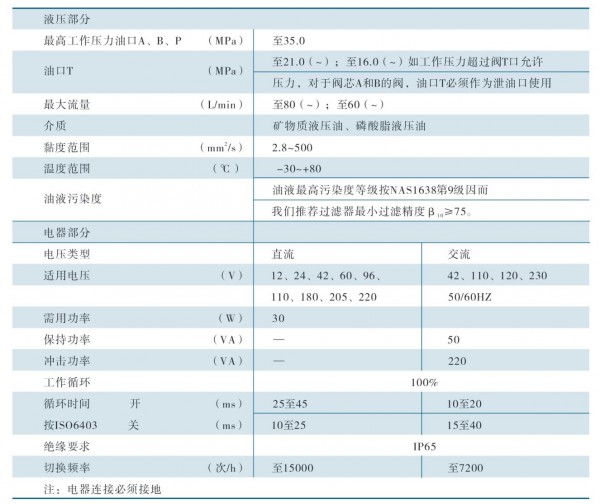 當電磁鐵末通電時,閥芯(3)被復位彈簧(4)保持在中位或起始位置(脈沖式閥除外)。閥芯(3)的動作由濕式電磁鐵(2)實現(xiàn)。當電磁鐵(2)通電時,電磁鐵的力經推桿(5)作用在閥芯(3)上,將其由靜止位置推到所需的工作位置。使油液由P到A和B到T或由P到B和A到T通。當電磁鐵斷電時, 閥芯(3)被復位彈簧(4)推回到原始位置,此時可以推動手動按鈕(6)使閥芯運動。