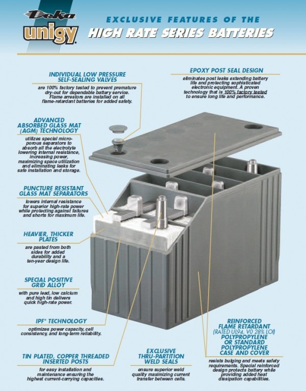 特點(diǎn) ⊙閥體.. ⊙膠體化電解質(zhì)... ⊙電腦鑄造電源通路柵板和計(jì)算機(jī)控制的氧化物... ⊙低備用損失... ⊙槽式板... ⊙由ICAO,IATA,以及DOT認(rèn)定的不會(huì)溢出... ⊙美國(guó)制造.. 優(yōu)點(diǎn) ⊙密封的結(jié)構(gòu)消除周期性加水,腐蝕性酸揮發(fā)和溢出。 ⊙電解質(zhì)不會(huì)層積,沒有均衡充電的需要。 ⊙增強(qiáng)了苛刻運(yùn)用下的耐性和深循環(huán)能力。 ⊙每月備用損失低于2%說明在運(yùn)輸和儲(chǔ)存中的消耗微不足道。 ⊙保證電池間電壓匹配。 ⊙空運(yùn)容易安全,不需要專門的包裝箱。 ⊙保證可靠的服務(wù),支援和品質(zhì)。 規(guī)范 電壓............常規(guī)12V(8GGC2是6V) 板合金....鉛鈣 柱............上螺母的螺栓或"旗"形端子,鍛造的軸襯 殼體/蓋......聚丙烯充電電壓....每單室循環(huán)2.30至2.35;浮充2.25至2.30 電解質(zhì)........硫酸觸變性膠體 排氣孔........自密封 美國(guó)德克蓄電池產(chǎn)品特點(diǎn): 容量 32.5 ~ 24h( 20hr rate to 1.75VPC@ 27 ℃ ) 壽命 設(shè)計(jì)浮充使用壽命為 10 年 @ 27 ℃ 。 特點(diǎn) Hovosorb 超細(xì)玻璃纖維棉隔板,鉛鈣板柵合金,槽式化成板,本森安全閥,環(huán)氧樹脂柱密封,高抗沖擊 PP 槽蓋。 特性 槽式化成保證電池達(dá) 容量,并使電池均衡性(尤其容量、電壓)達(dá)到優(yōu)化。環(huán)氧樹脂密封消除電池泄漏 美國(guó)德克 供應(yīng)德克蓄電池電池價(jià)格報(bào)價(jià)直銷 德克蓄電池AGM系列 美國(guó)德克蓄電池Deka AGM系列產(chǎn)品特點(diǎn): 容量 32.5 ~ 24h( 20hr rate to 1.75VPC@ 27 ℃ ) 壽命設(shè)計(jì)浮充使用壽命為 10 年 @ 27 ℃ 。 特點(diǎn) Hovosorb 超細(xì)玻璃纖維棉隔板,鉛鈣板柵合金,槽式化成板,本森安全閥,環(huán)氧樹脂柱密封,高抗沖擊 PP 槽蓋。 特性槽式化成保證電池達(dá) 容量,并使電池均衡性(尤其容量、電壓)達(dá)到優(yōu)化。環(huán)氧樹脂密封消除電池泄漏。