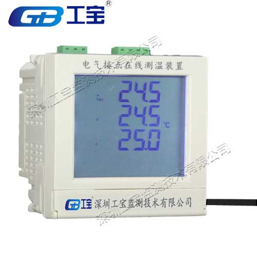 本產品多可以在線監測12個點位的的溫度(溫升),通過無線傳輸,在主機的屏幕上實時顯示,由主機對這些監測點的溫度進行實時監控。當任何一個監測點的溫度超過設定溫度后會輸出三個級別報警提示(指示燈、顯示值閃爍及三組無源繼電器輸出);產品提供RS485接口,MODBUS通訊協議,可以上傳環境溫濕度、各監測點的溫度和電池電量等信息。