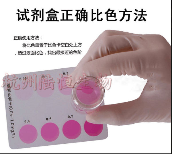 取一潔凈的比色管加待測水樣至管的刻度線(15mL),將余氯測定試劑倒入比色管中,搖動至完全溶解后,將管提至離比色卡約2厘米高的位置與標準色階至上而下目視比色,與管中溶液色調相同的色階即是水中余氯的含量(毫克/升)。
