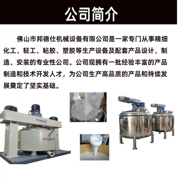 佛山市邦德仕機械設備有限公司處珠三角腹地,城市經濟,商貿,技術高速發展的大都市--佛山市,交通與通訊相當便利。專業生產:鋰電池負極材料包覆設備,改性石墨材料設備,一二類壓力容器,動力混合機,捏合機,強力分散機,高速分散機,行星攪拌機,化工機械,化工成套設備,反應釜,行星動力混合機,粉體混合機,玻璃膠設備,硅膠設備,密封膠設備,灌封膠設備,硅酮膠設備,膠水設備,PU膠設備,聚氨酯設備,白乳膠設備,TPU設備,阻燃劑設備,熱熔膠設備,跑道膠設備(硅PU),干掛膠設備等。是一家專門從事精細化工、輕工、粘膠、塑膠等生產設備及配套產品設計、制造、安裝的專業性公司。