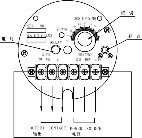 2.粗調(diào)(在空倉(cāng)、探頭沒(méi)有接觸到物料時(shí)調(diào)整):先把細(xì)調(diào)旋鈕(HDNSITIVITY ADJ)調(diào)到zui高靈敏度處(白色標(biāo)記線對(duì)準(zhǔn)H),然后用小一字螺絲刀調(diào)整粗調(diào)旋鈕(COARHD),直到指示燈(INDICATOR)剛好點(diǎn)亮。此時(shí),順時(shí)針調(diào)整細(xì)調(diào)旋鈕,若指示燈在細(xì)調(diào)旋鈕調(diào)到刻度92以前即熄滅,則粗調(diào)調(diào)試完畢,若不能熄滅,請(qǐng)重復(fù)以上操作;