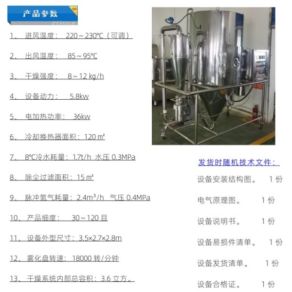 氮氣閉路循環(huán)高速離心噴霧干燥設(shè)備防爆型根據(jù)需方工藝要求,物料為液態(tài),含有有機溶劑無水乙醇,干燥后粉體顆粒有機溶劑含量低,處理量10 ㎏/h。設(shè)計進風溫度大于 220℃,干燥介質(zhì)氮氣循環(huán),循環(huán)介質(zhì)中氧氣含量小于 3%以下。物料接觸部分SUS304。系統(tǒng)所有電機防爆,操作箱防爆,防爆等級: ExDIIBT4。