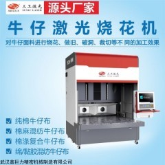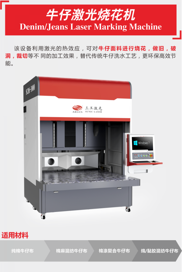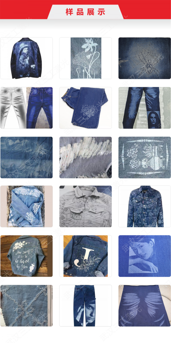 棉麻混紡水洗破洞做舊牛仔激光燒花機:該設備利用激光的熱效應,可對牛仔面料進行燒花,做舊,破洞,裁切等各種的加工效果,替代傳統牛仔洗水工藝,更環保高效節能。