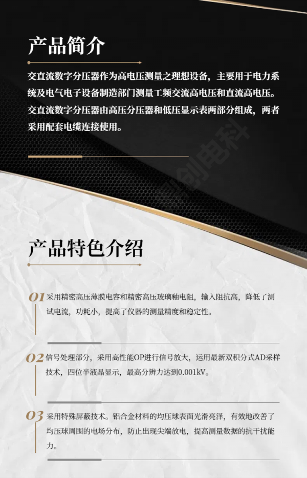 交直流數字分壓器采用精密高壓薄膜電容和精密高壓玻璃釉電阻,輸入阻抗高,降低了測試電流,功耗小,提高了儀器的測量精度和穩定性;
